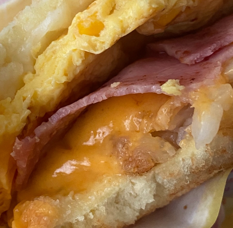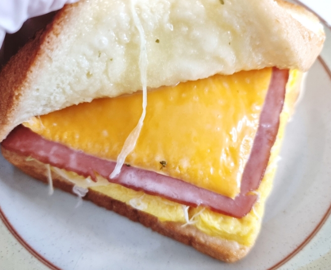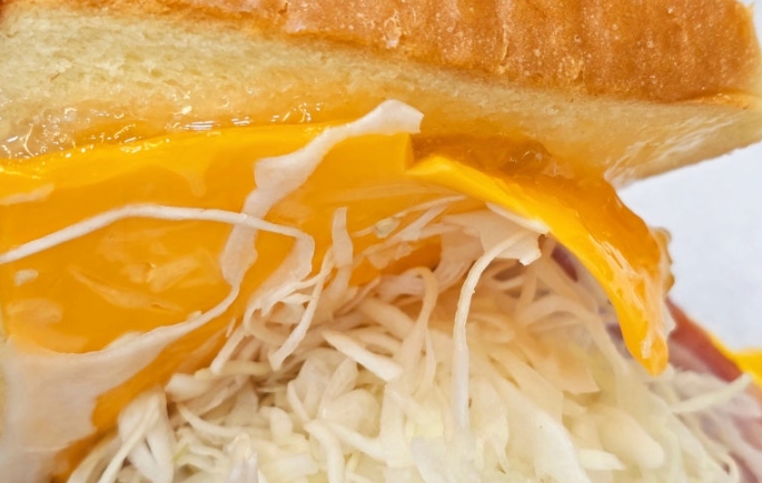 슬라이스 햄, 계란, 치즈, 양배추, 콘샐러드가 식빵 사이에 꽉 채워져 있고, 이삭 특제 소스가 부드럽게 더해져 있어요.